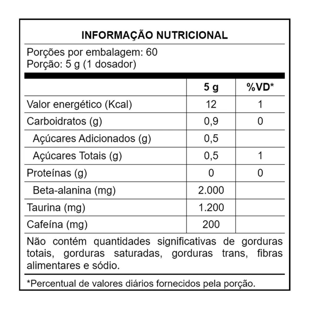 ✅ 200 mg de Cafeína por dose: Estimula o sistema nervoso central, aumentando o estado de alerta e a disposição para o treino.