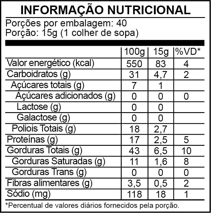 ✅ Alto teor de proteínas: Cada porção de 15g oferece entre 2,5g e 2,8g de proteínas, dependendo do sabor.